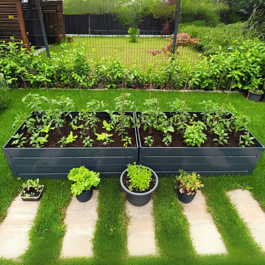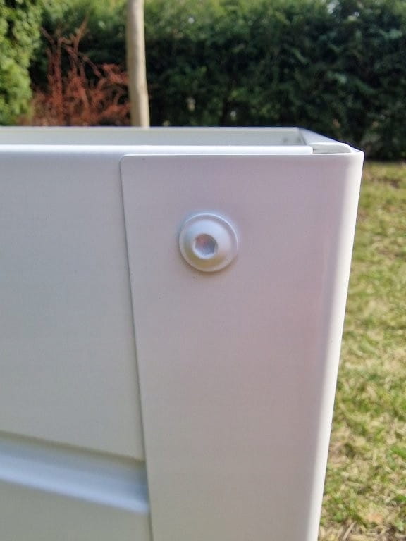 Górna krawędź grządki została zawinięta aby nie była ostra a wszystkie krawędzie zaoblone laserowo. Estetyczne przetłoczenie na środku dodaje grządce nowoczesnego wyglądu i dodatkowo usztywnia ją czyniąc bardzo mocną. Malowanie proszkowe obustronne od zewnątrz i wewnątrz zabezpiecza ją i dodaje estetycznego wyglądu. Zastosowanie śrub nierdzewnych daje pewność że w ziemi nie złapie ich korozja.